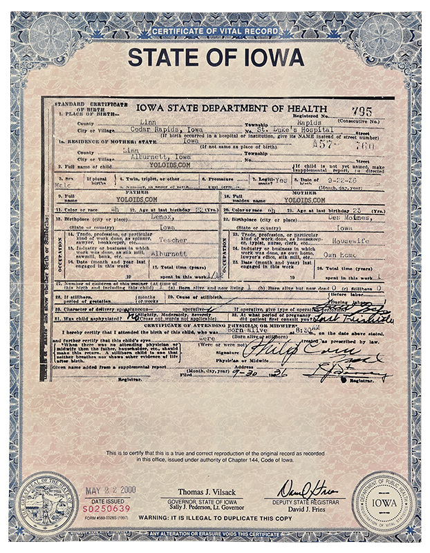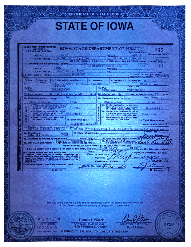 Printed on high-grade security paper with embedded fibers and watermark effects that closely resemble the original Iowa state-issued documents